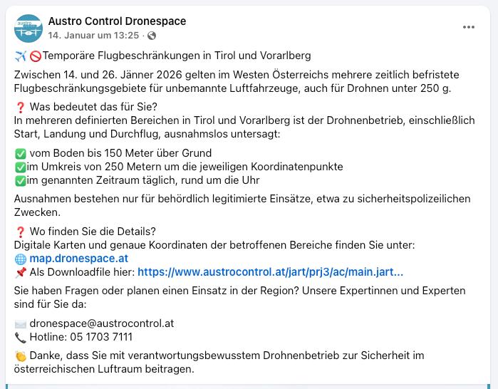 Zwischen 14. und 26. Jänner 2026 gelten im Westen Österreichs mehrere temporäre Flugbeschränkungsgebiete für unbemannte Luftfahrzeuge – also auch für Drohnen unter 250 g, wegen dem Weltwirtschaftsforum (WEF) in Davos. In den betroffenen Bereichen ist der Drohnenbetrieb ausnahmslos untersagt (Start, Landung und Durchflug).